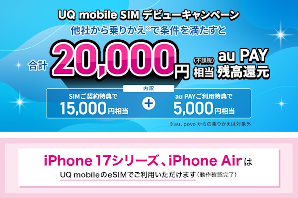 「SIMカードのみ+MNP」の申込みの方であれば現在は「UQモバイル公式サイト」で「au Payご利用特典」キャンペーンが行われています。